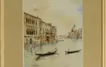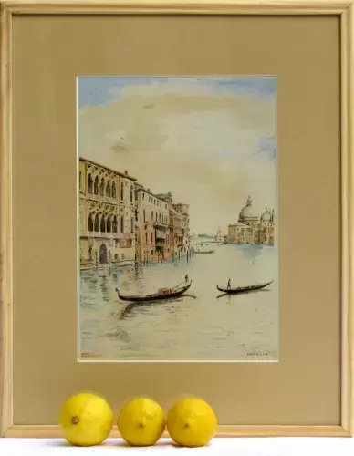 Deux gondoles s'éloignent l'une de l'autre sur le Grand Canal. Cette représentation de Venise se distingue par un traitement de l'eau très discret pour mieux mettre en relief les palais, leurs ogives ouvragées et leurs élégants balcons. Une grande rigueur préside dans le rendu de la perspecpective. La netteté dans les coloris résulte d'un travail à sec du support.
