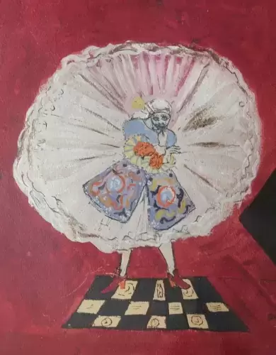 Sur un échiquier cabalistique, un clown extravagant danse dans une pièce aux murs rouges. Sir Francis Rose nous plonge dans l'étrange avec cette œuvre emplie de symboles. Le fond rouge sang est transpercé d'un triangle noir en forme de coin. On peut y voir l'antithèse de la fameuse composition de Rotchenko, où le coin rouge du communisme écrase la noire contre-révolution.