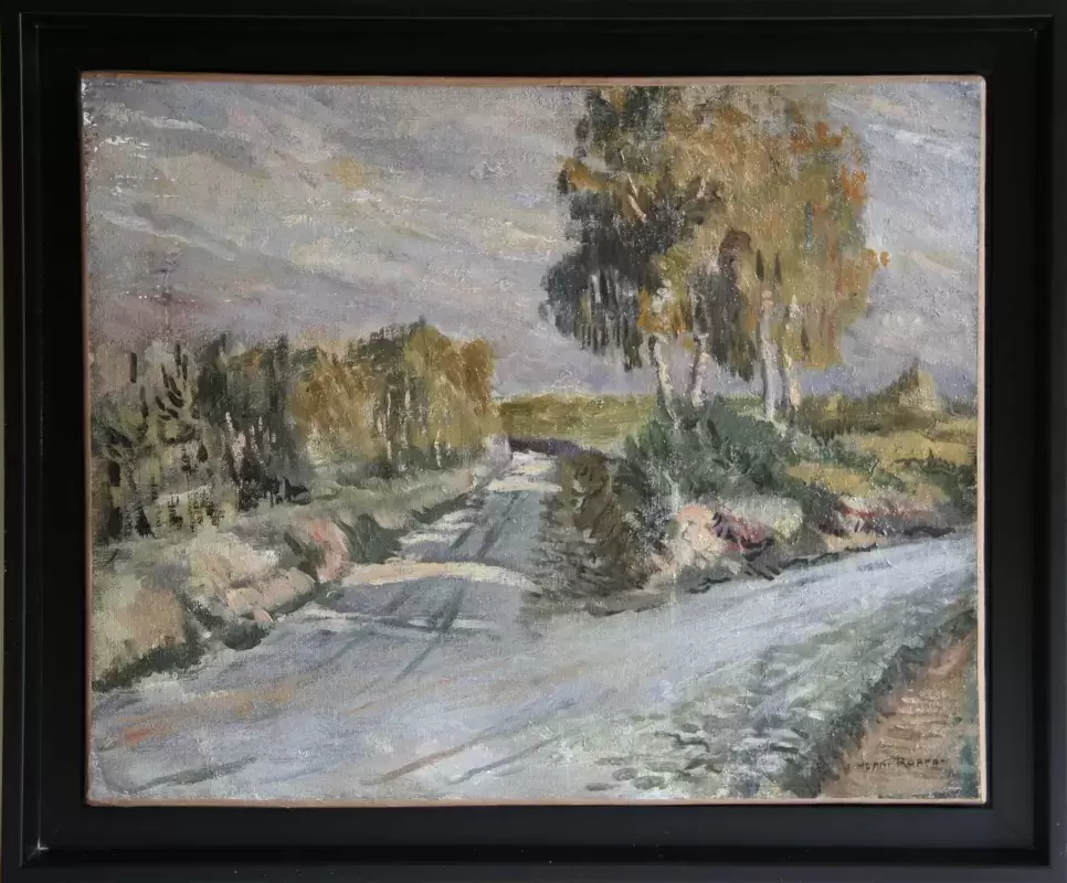 Cette œuvre représente un chemin de campagne après l'orage au moment où le soleil revient. Le regardeur se trouve devant le choix entre deux routes. L'encadrement est contemporain, dans une caisse américaine. Signé Henri Robert. Pour information : Il est peu vraisemblable que ce soit une œuvre du peintre suisse Henri Robert (1881-1961) : ce dernier signe toujours en minuscules et avec la seule initiale de son prénom.