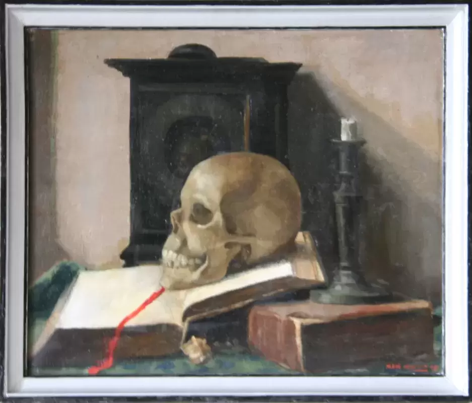 Le traitement est nerveux avec de vigoureux aplats de peinture et des touches lâches. La connaissance est symbolisée par le livre. La bougie éteinte représente la vie qui se consume. L'horloge témoigne de l'écoulement inexorable du temps et le crâne est la représentation du devenir mortel de chaque être. Le signet rouge du livre marque la page de lecture et semble aussi s'écouler du crâne comme un filet de sang.