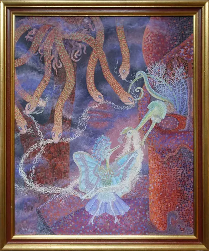 Un serpent à sept têtes, et deux personnages oiseaux-papillons. Cette oeuvre provient de l'exposition de Guy Puccio de juin 1975 à la galerie Matignon. Le carton d'invitation dédicacé est joint au tableau.